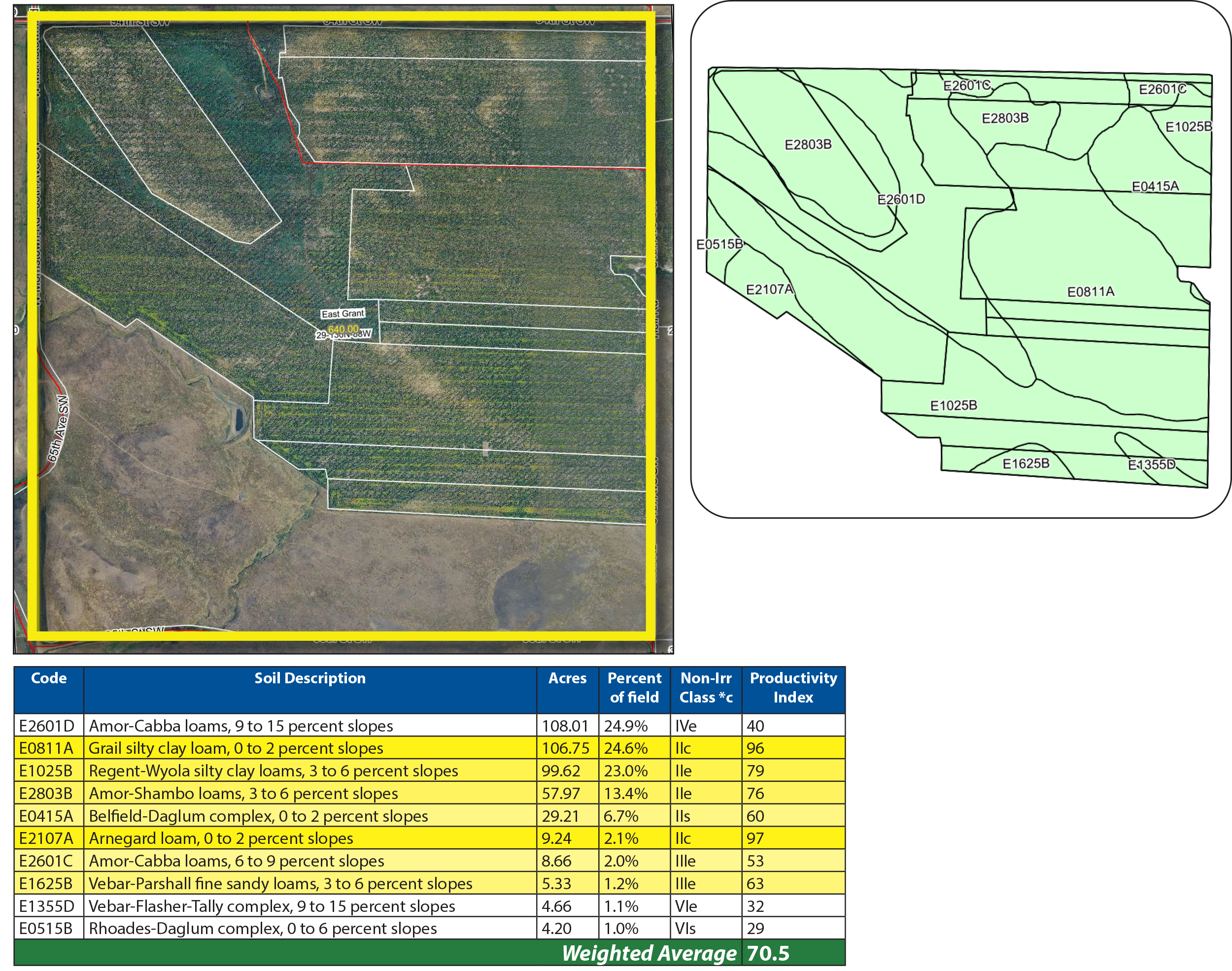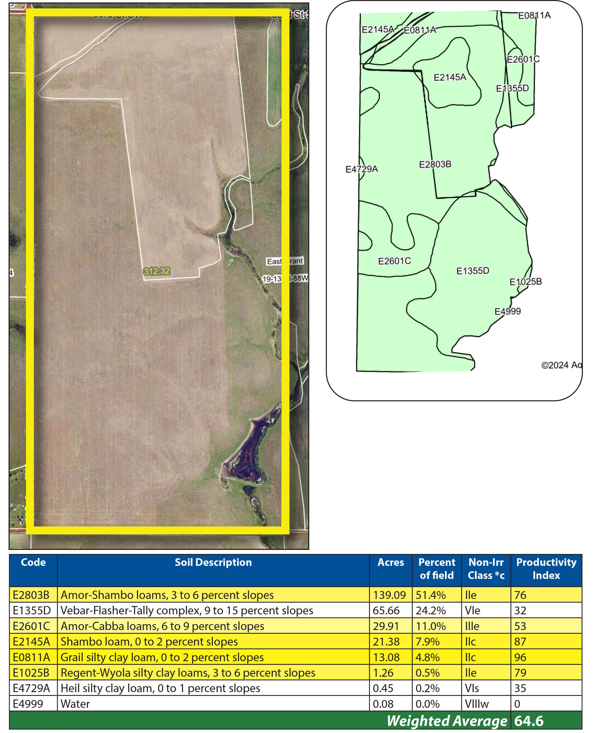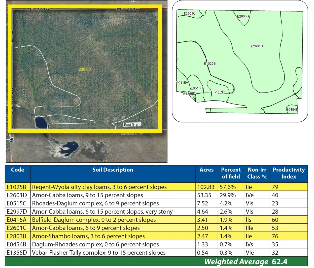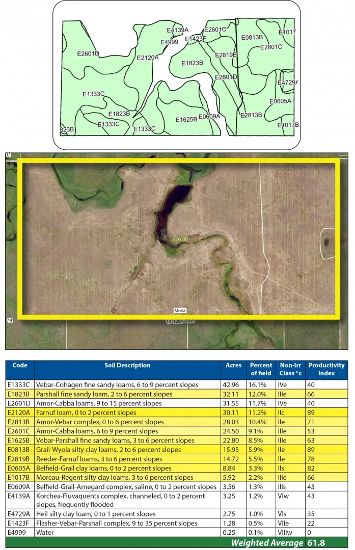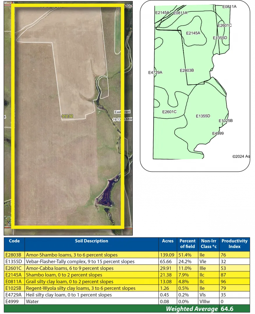 Parcel 2 is another half-section of cropland situated just 1.5 miles north of the Cedar River, near Morristown, SD. This property also features premium soils, including Amor, Shambo, and Grail Loams, with a strong SPI average of 64.6.