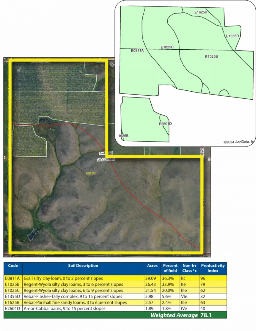 The majority of this parcel consists of thriving native and introduced grasses across its grazing pasture. However, the northern 100 acres of cropland stand out, featuring Grail and Regent-Wayola Class II soils that boast an impressive SPI over 78. Remarkably, the entire 480 +/- acre parcel maintains an SPI average greater than 56.